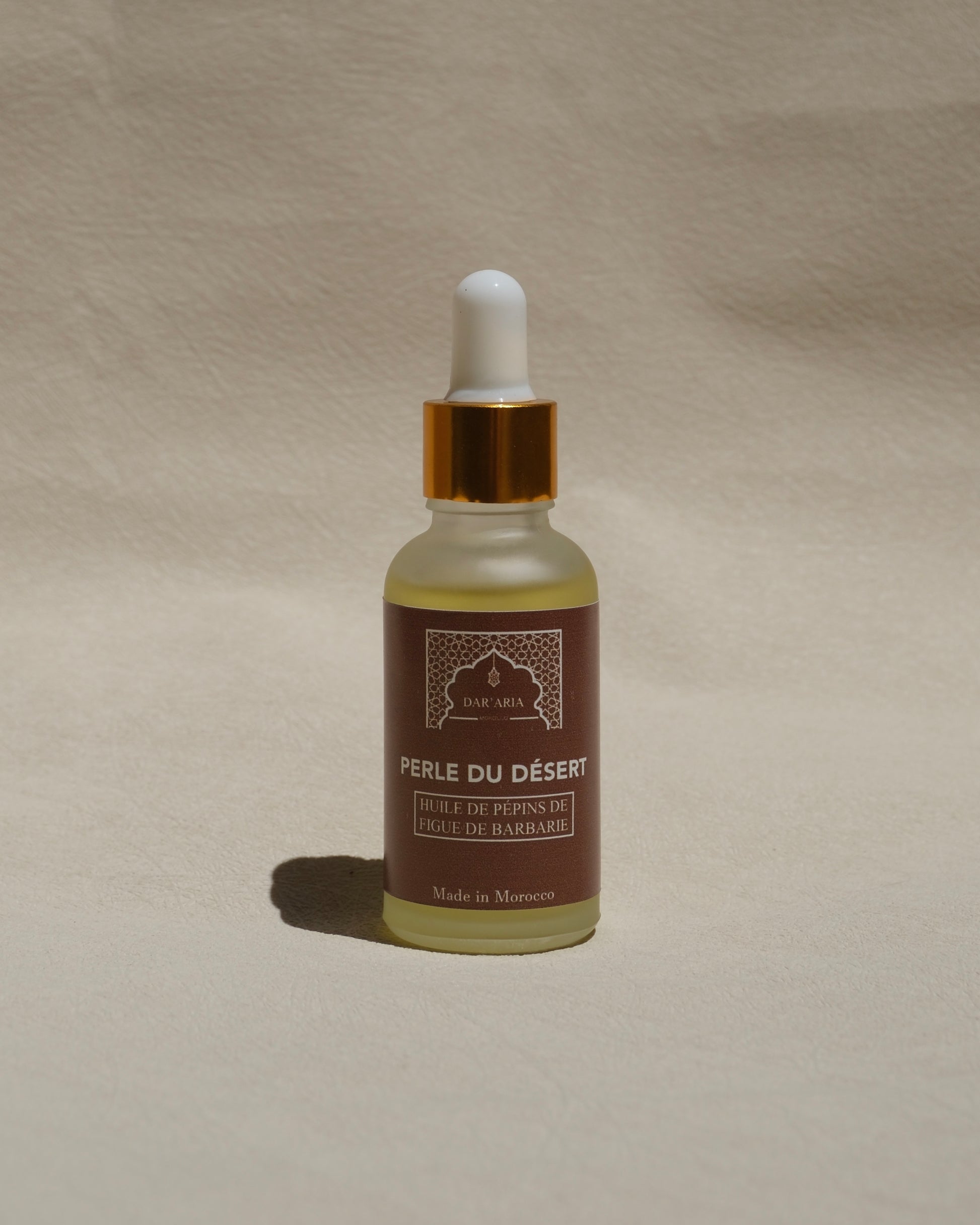 La Perle du désert, issue d’une première pression à froid de pépins de figue de barbarie, 100 % pure et riche en vitamine E, oméga-6 et antioxydants, hydrate, raffermit et régénère la peau tout en laissant un teint lisse et lumineux.